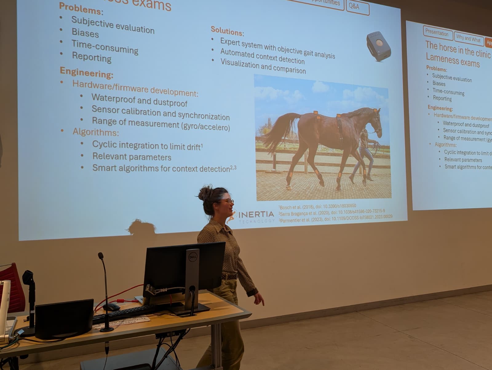 Subsequently, Jeanne presented the Equi-Pro® mobile gait analysis system, the research projects related to the equine field that Inertia was involved in, and how our company can support research groups to quantify some aspects of the horse-human relationships.